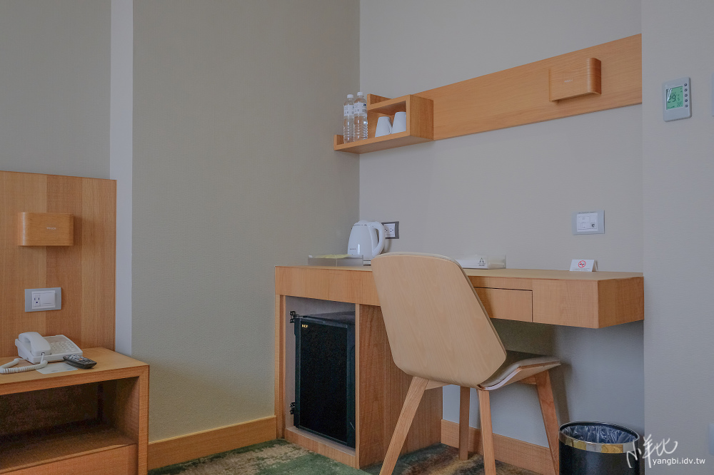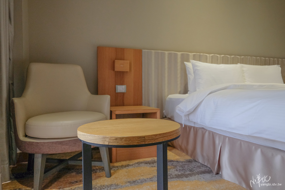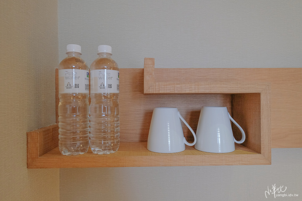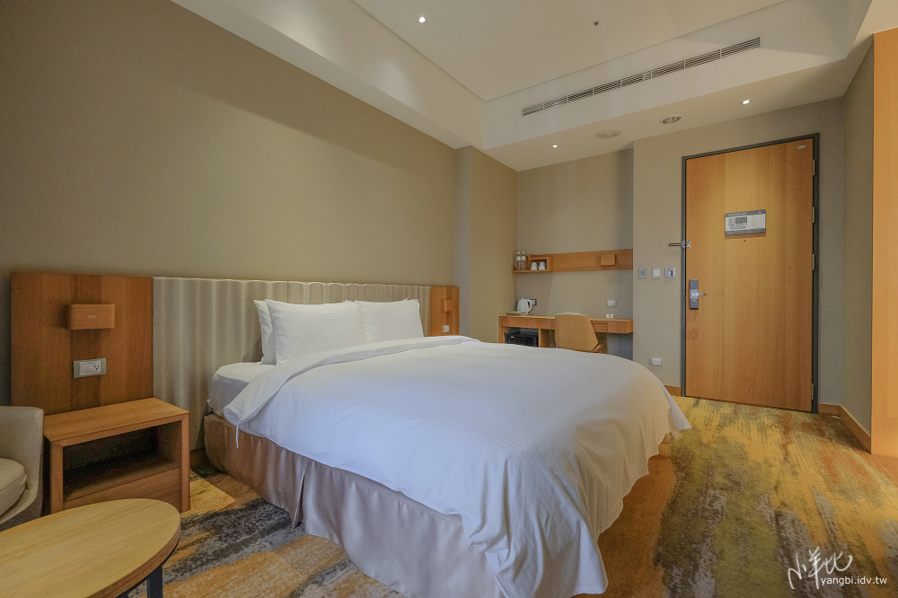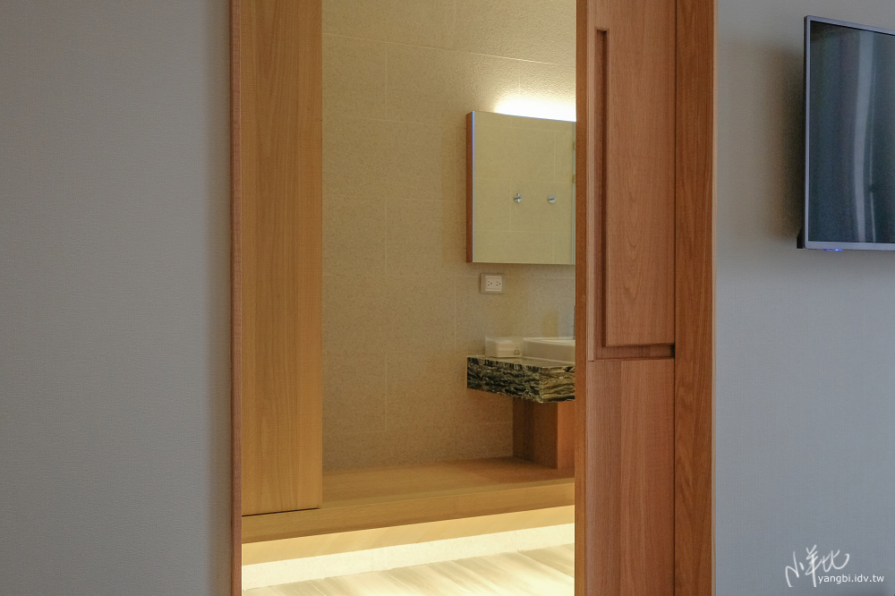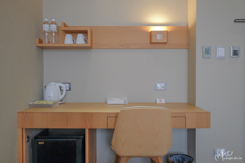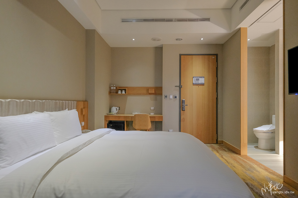 房間風格採簡單木質配色,我還蠻喜歡這樣的風格的,這讓我想起之前在嘉義住過的天成文旅繪日之丘文創旅店以及日本函館的The Share Hotel。床大小軟硬適中,我們米家一家三口兩大一小OK。右邊的木質拉門進去就是浴廁間。