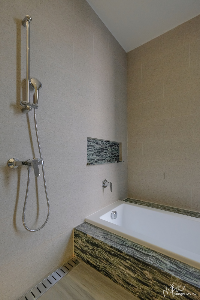 淋浴的空間在浴缸的一側,這空間真的還不錯的,幫小米洗澡還可以順便玩水。淋浴的出水量充足,沖澡很舒服。