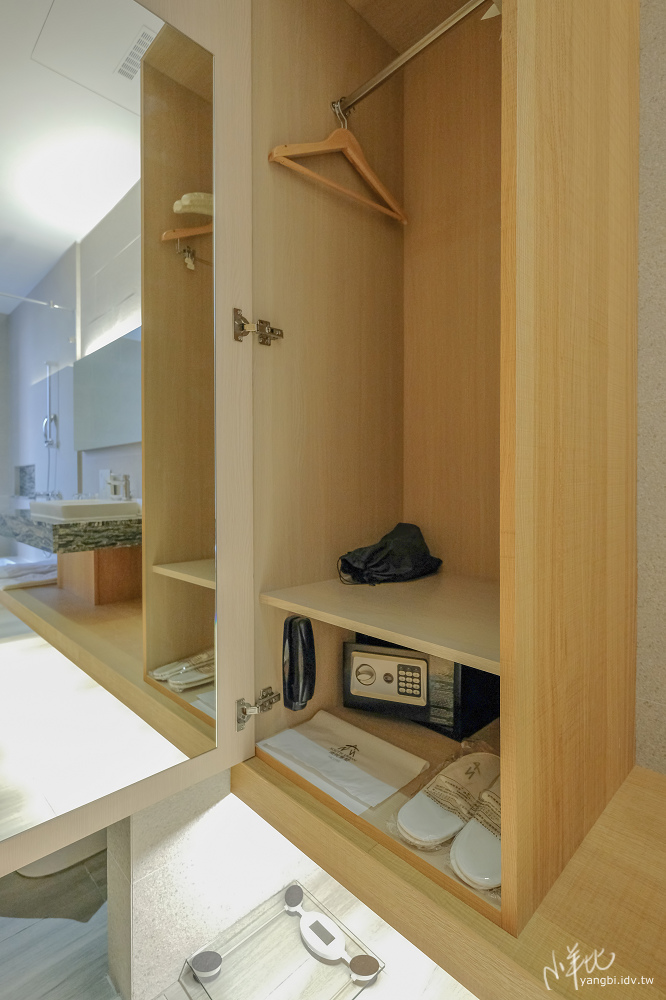 在盥洗台旁正對衛浴入口處的則是衣物間,裡頭有衣架、拖鞋、保險箱、體重計及吹風機等備品。吹風機是Panasonic EH-ND51型號,風量還可以。