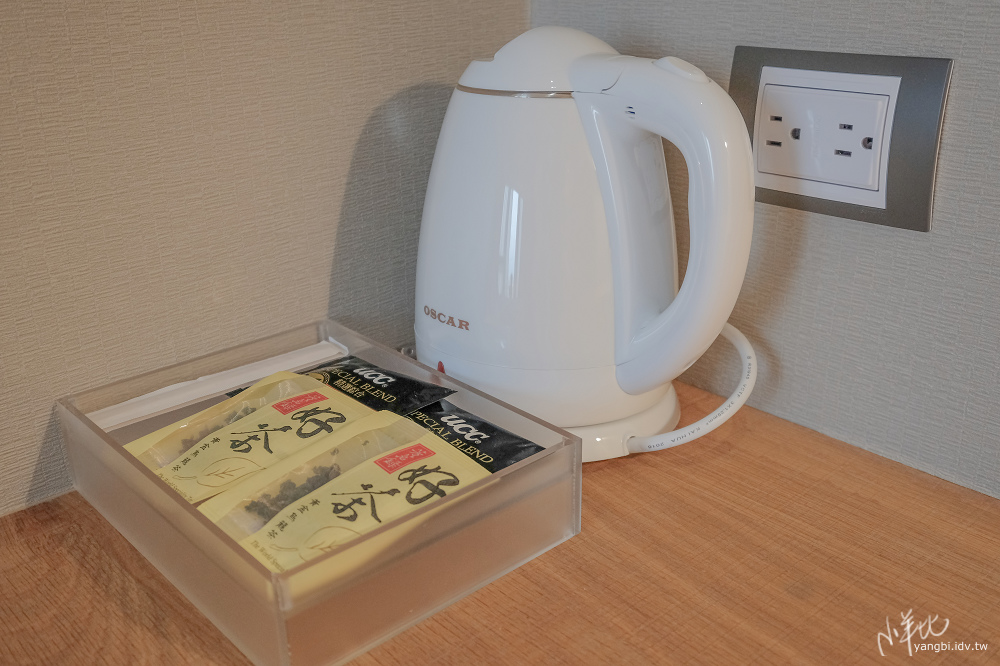 桌上角落則放了快煮壼及茶包等備品。這個烏龍茶裡頭是直接放茶葉而不是一般的茶包,還蠻特別的~